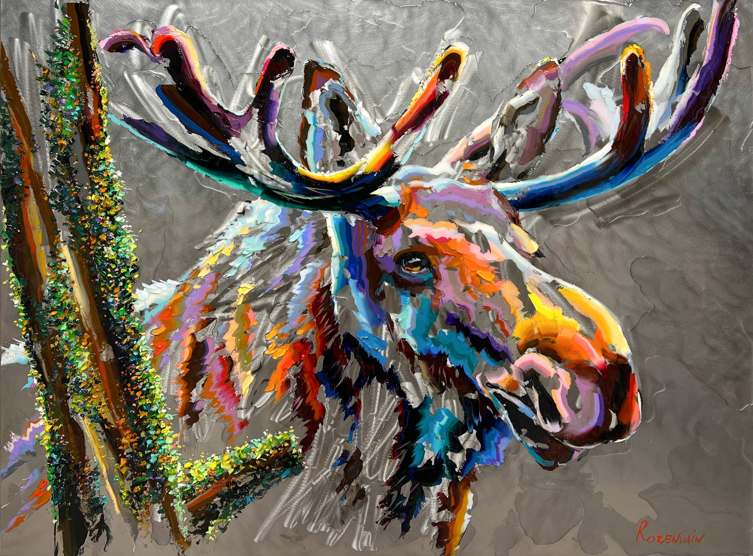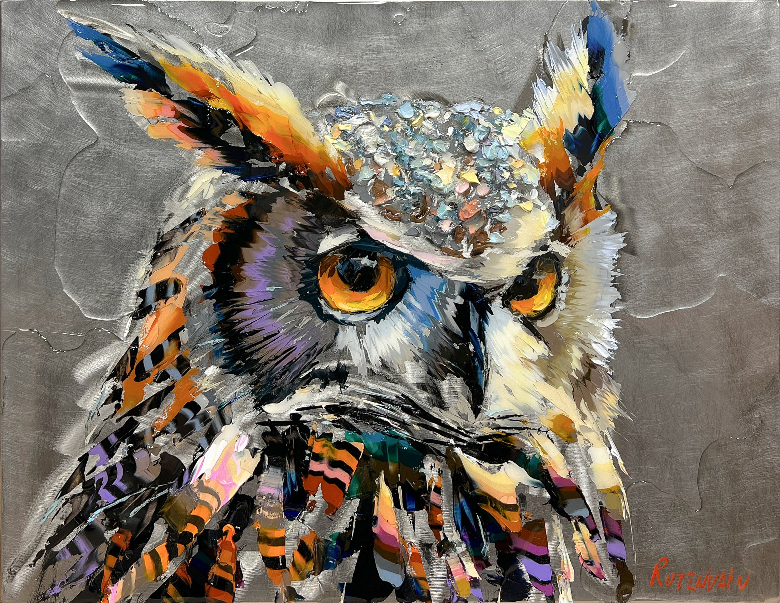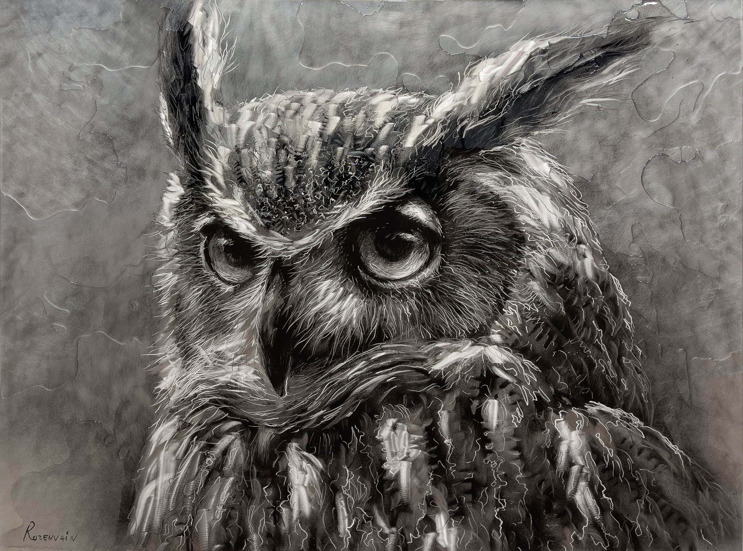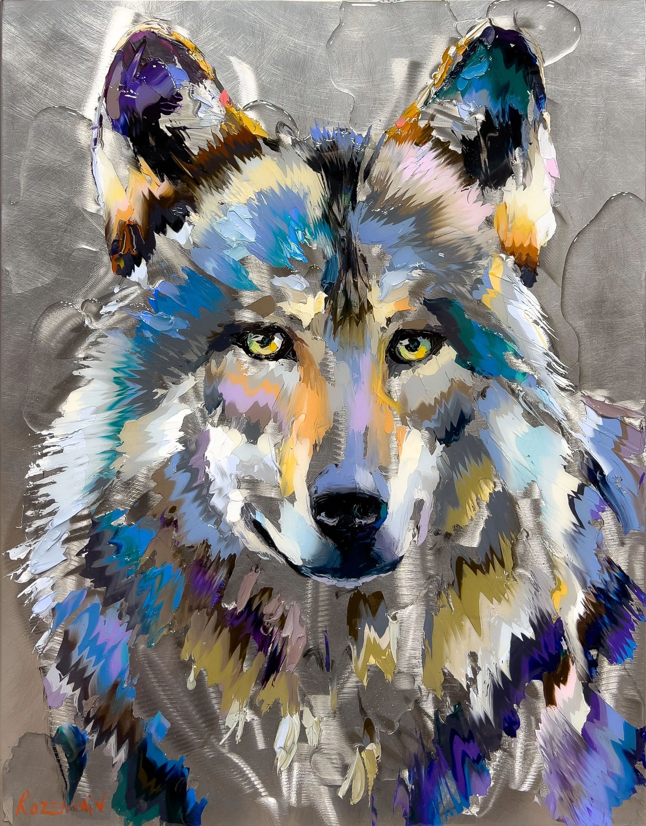His most recent series of animal portraits merge engraving and painting on self-fabricated stainless steel “canvases.” Rozenvain takes a layered approach to these pieces alternating between mark-making by adding paint or engraving into the stainless-steel support to reveal the metal’s reflective qualities. He uses industrial materials and tools from fine rotatory bits to industrial gridding routers to render soft, organic forms and striking realism. The combination of oil paint, rotatory tools, stainless steel, and resin creates a fascinating mix of nature with contemporary mediums.